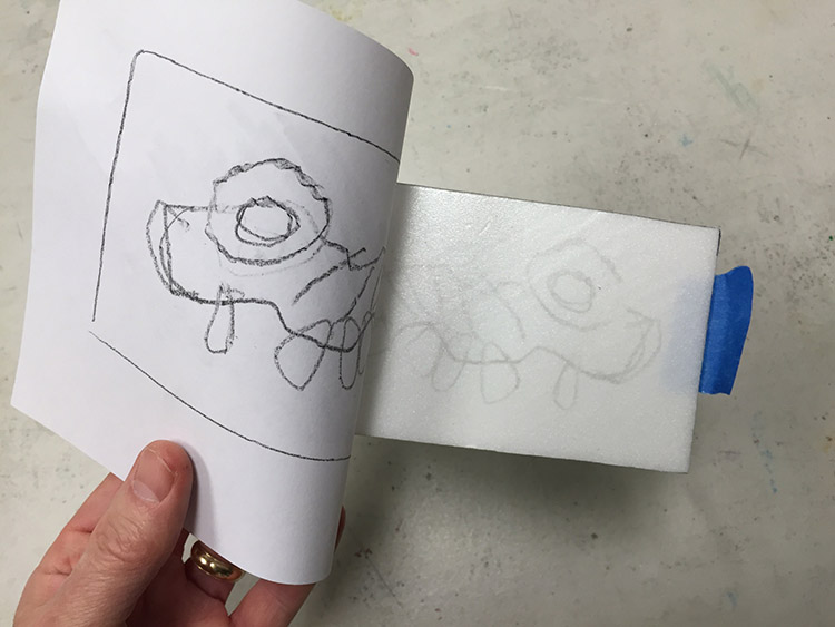 Hold the plate and paper carefully so the paper doesn’t slip around while you work. You can use a little bit of painter’s tape to secure the paper as well. As you burnish with the pencil, be careful not to damage the styrofoam plate. Any indention such as a pinch, scrape, or poke, will become part of the final image on the printed piece.