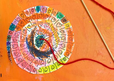 Have everyone draw patterns throughout the spiral snake. They can start with a pencil or a black marker. The snake is a spiral, and when cut, will create a 3D bouncy sculpture when dangled on a string. Decorate the snake with oil pastels and encourage kids to make them very artistic. Blend the colors and mix them.